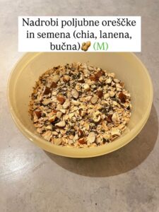 - Oreščki in semena (mandlji, chia, lanena, bučna…)